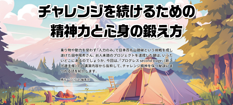 乗り物や動力を使わず「人力のみ」で日本百名山踏破という挑戦を成し遂げた田中陽希さん。前人未踏のプロジェクトを達成した鍵は、いったいどこにあるのでしょうか。今回は、「プログレス second stage」(新スポ連主催)での講演内容から抜粋して、チャレンジ精神を保つ秘訣にまつわる話を紹介します。